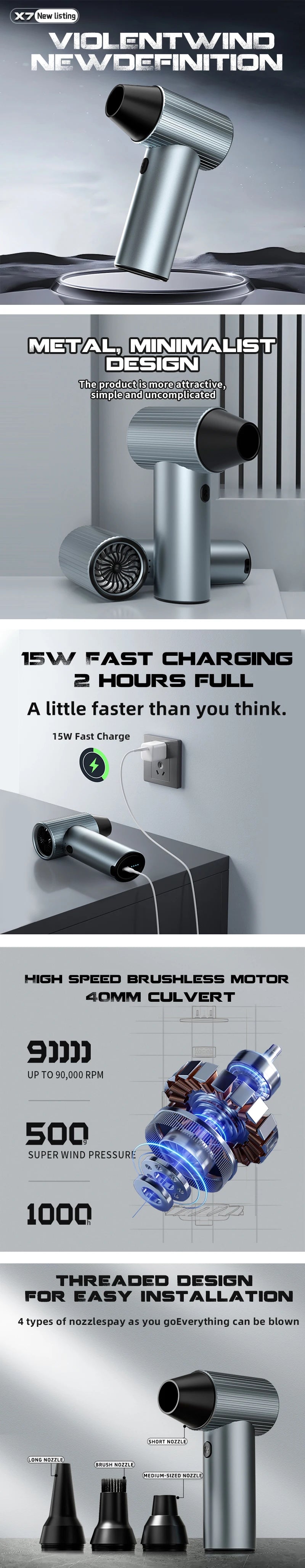 The genuine X3 upgraded violent turbofan adopts a brushless DC high-speed motor, with a maximum output speed of 130000 RPM, which can generate super strong wind speeds of up to 52 meters per second, equivalent to a level 16 typhoon. It has strong power, long-lasting stability, and does not burn the machine under long loads. It also has charging protection and overheating protection functions, with an ultra long battery life of up to 4 hours in one gear. It has two 217000 built-in batteries with a battery capacity of 3000mAh, making it more durable to use! Three speed regulation provides you with a unique experience