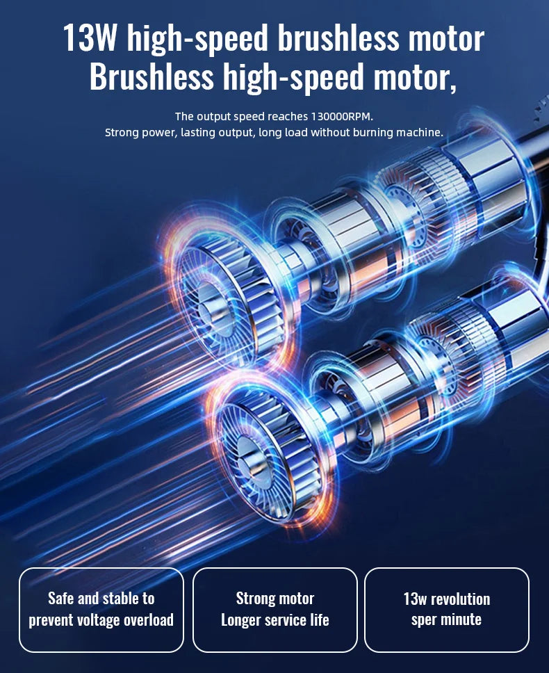 7. Easy to use operation: Adopting three speed regulation with indicator light display. The user-friendly design of portable turbo fans ensures easy functionality. In addition, the charging board also has safe and reliable charging protection and overheating protection functions. The internal brushless motor can achieve high speeds of up to 130000 RPM (revolutions per minute).