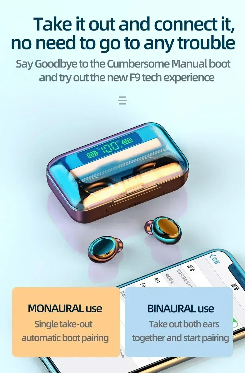 New F9 Bluetooth Headphones 9D Stereo High Bass Sport Earphones Handfree Touch Control Tws Wireless Earbuds Waterproof Headset